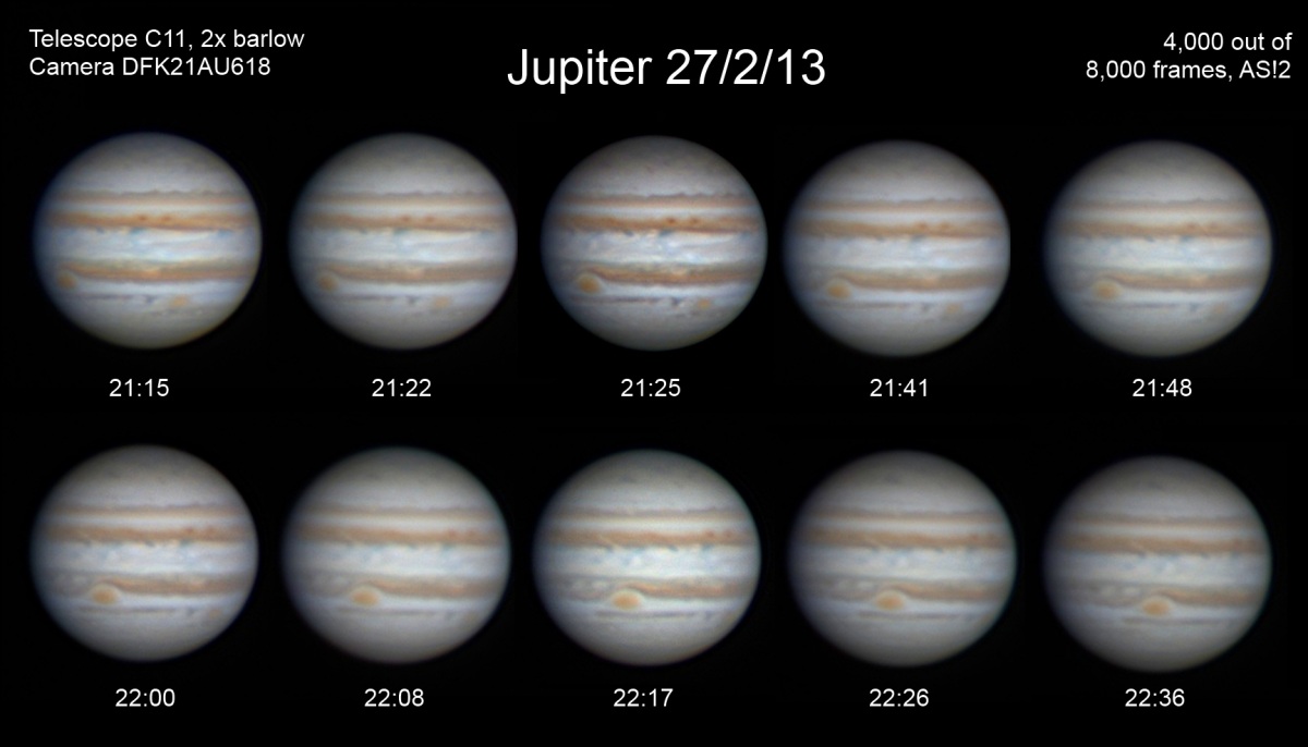 27-2-13 Jupiter composite. Celestron C11 EdgeHD, DFK21, 2x barlow, 4000 frames from 8000, AS!2.