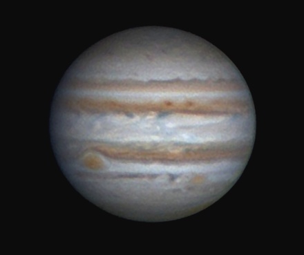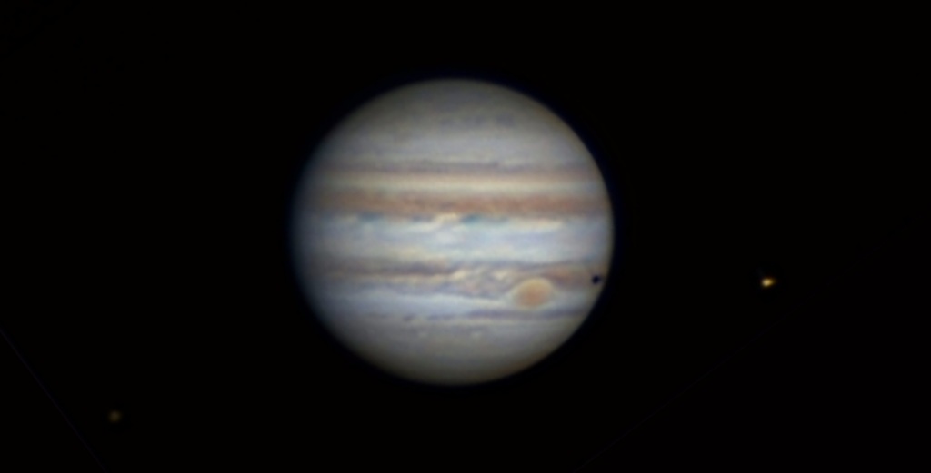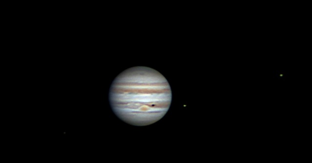 18-2-13 Jupiter with Io and Io's shadow, Ganymede to the right and Callisto to the left. Celestron C11 EdgeHD, DFK21, 1,700 from 10,000 frames, Registax 5.