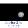 1-11-11 Jupiter with Io, Skywatcher 250 dob MS Lifecam, 1800 frames @ 10fps, 1730 stacked Registax 5.
