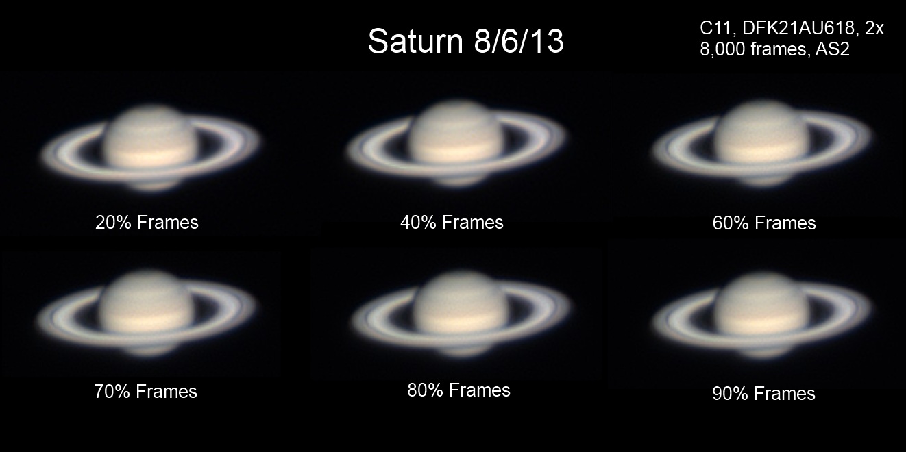 8/6/13 Celestron C11 EdgeHD, EQ6, DFK21, 2x barlow. Test to show how quality/detail chnages with the number of frames.